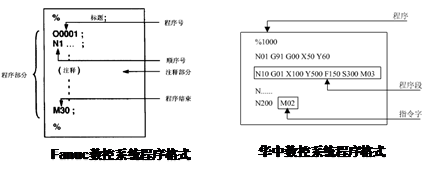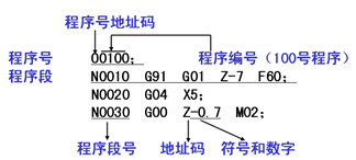 零件加工程序由程序号(名)和若干个程序段组成。每个程序段又由程序段号和若干个指令字组成,每个指令字由字母、符号、数字组成。每段程序用;表示结束。程序段是数控程序的基本组成单元。