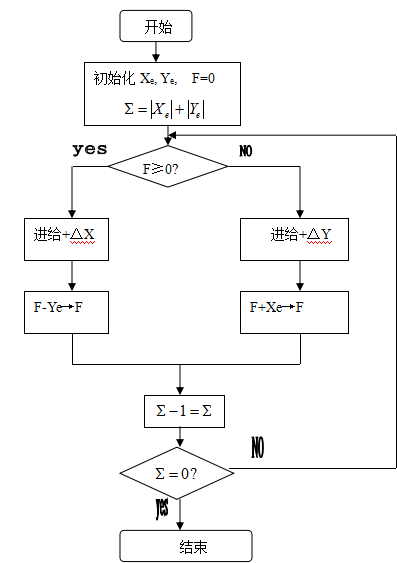 第四拍:终点判别—每进给一步,都要判别刀具是否到达终点,若已到达终点,则停止插补,否则,继续循环以上4个节拍,直至到达终点。