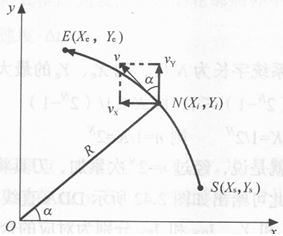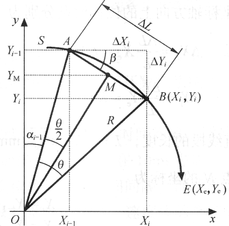 图3.37所示为第I象限顺圆弧,圆心在坐标原点O,起点为S(Xs,Ys)终点为E(Xe,Ye),圆弧半径为R,进给速度为F,A(Xi-1,Yi-1),B(Xi,Yi)是圆弧上两个相邻的插补点,弦/AB是圆弧AB对应的弦长