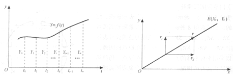 如图3.35所示,在XOY平面内的直线/OE,起点为O(0,0),终点为E(Xe,Ye),动点为N i-1(Xi-1,Yi-1),编程进给速度为F,插补周期为TS,根据数据采样法插补的有关定义,每个插补周期的进给步长为ΔL=FTS,根据几何关系,可求得插补周期内的刀具在各坐标轴方向上的位移增量分别为