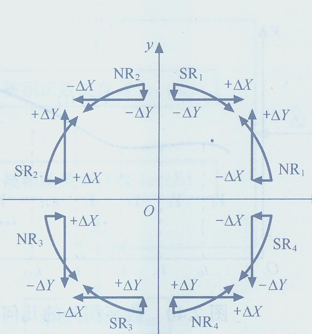 第一拍:偏差判别—偏差当前位置相对于编程轮廓的偏离情况,以决定进给方向。