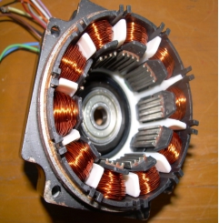 图4.2是步进电机的定子和转子结构图,图中是五相绕组有10个线圈。转子圆周上分布许多齿,但分为两段,相互错开一半齿距角这是混合式步进电机的结构。