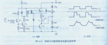 (2)高低压切换型驱动电路如图4.17 所示,CP脉冲的上升沿,脉冲变压器作用,高压供电,绕组电流很快上升。之后由低压供电,电流减小节能。这样既能保持节拍变换的较大转矩,又能使电机绕组电流减小,节能。