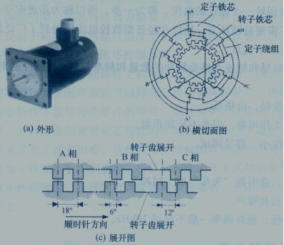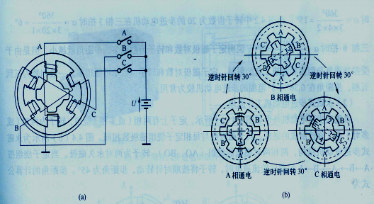 图4.3是三相反应式转子20个齿的横切图和展开图。定子六个绕组连接后,构成三相绕组空间互错60°,转子齿芯角18°,如图A相与转子齿对齐,B相相差6°错齿,C相相差12°。若A相通电改为B相通电,则转子顺时针转6°,这时C相又差6°,若定子通电顺序一次为A-B-C-A转子就转动起来。
