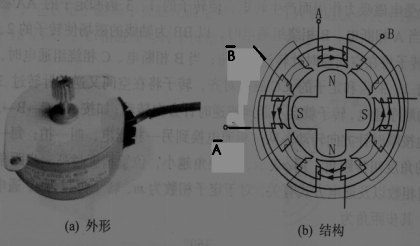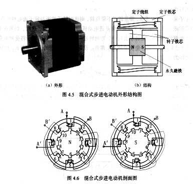 永磁式步进电机的外形和定子转子结构示意图如图4.5所示,定子有8个线圈8个磁极连接成A、B两相,转子有两对磁铁组成。原理当电流由A+进入,A-出时,定子的上下磁极为S,左右N,对应的转子磁极和定子磁极吸引,这时如果改为B+进,B-出,转子顺时针转过45°。第三节拍,电流A-进,A+出,这是定子A相磁极相反左右SS。上下NN转子可以继续转动。