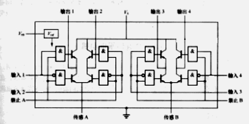 H型驱动器: TTL输入,输出可驱动46V的负载,每相电路可达2.5A。一个芯片可以驱动一台两相永磁或混合步进电机。 如图4.19所示是两项混合式功率放大器电路。 输出12和34连接两相电机的两个绕组的A+A—;B+ B- 。禁止A、B相当于使能输入端,输入1.2 和3.4反向,保持H桥臂不能同时导通,防止短路。 节拍是输入1、2、3、4应该是1000,0010,0100,0001。