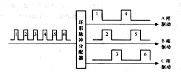 2. 硬件脉冲分配器:由硬件构成可以如图是单三拍A-B-C-A通电方式。