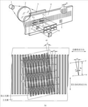 光栅尺是一种直线位移测量装置,它是在透明玻璃或金属的反光平面上刻上平行、等距的密集刻线制成的光学元件,当两个光栅尺相互重叠中间留有间隙(0.05~0.1mm),中心线倾斜很小的角度(