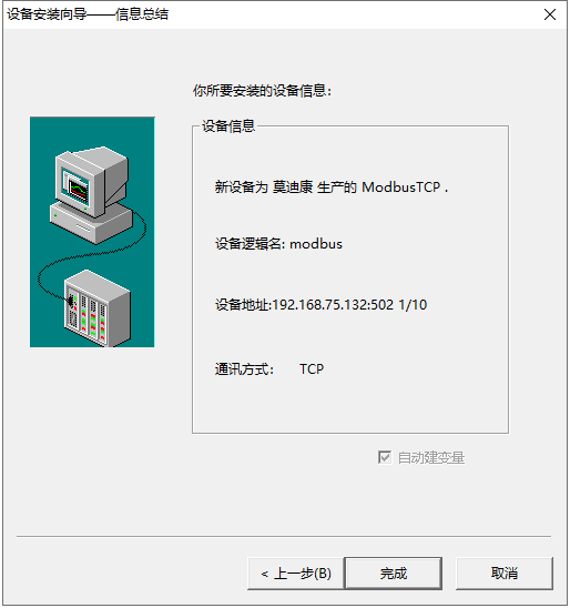 (2)在设备配置阶段,设备的地址我们使用从站预留的ip地址进行配置,端口为502,超时时间我们默认填写10毫秒,因此设备地址一栏填写为:192.168.75.132:502 1/10。其余设置信息,按以下参数进行配置: