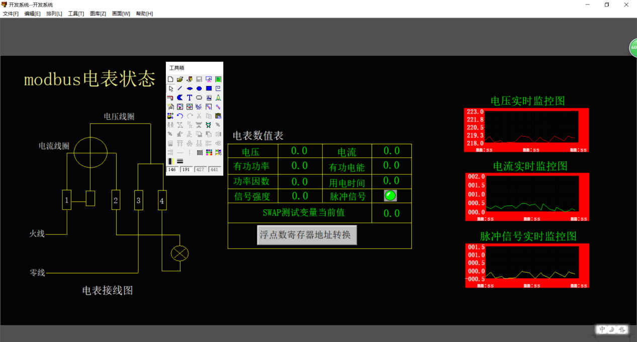 (8)因为从Modbus设备的从站发送过来的数据不会是静止的数据,而是以一种动态跳动的形式展现出来,所以利用组态王的报表功能,对重点需要监控的动态数据:电压、电流和脉冲信号配置相应的实时监控线型图。为了使得从站的Modbus设备更加形象,根据已设定好的变量,模拟插入电表接线图。效果如图3.15所示。