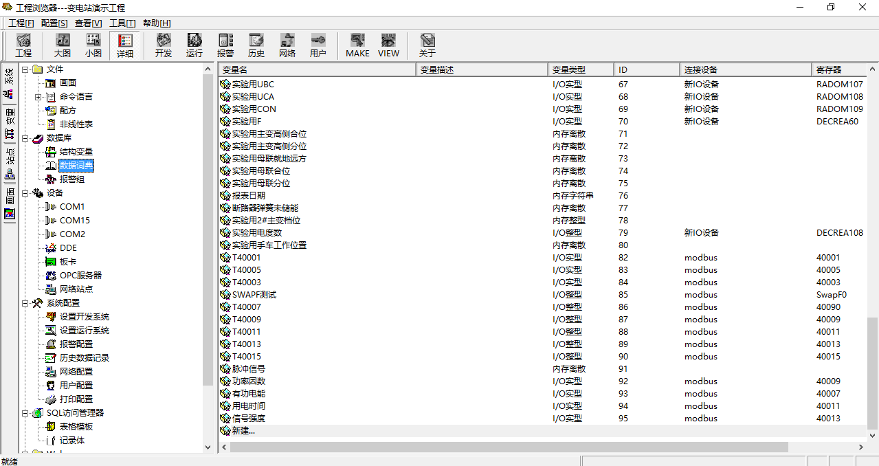 变电站自动化系统的平台搭建完之后,就需要在系统的数据库的数据词典内配置变量参数,通过这些变量,系统可以实现不同类型数据的接收、处理、存储和发送。而根据Modbus从站的模拟,我们需要建立八个变量来模拟从站发送的八种不同数据,由于每个变量在modbus协议内占用两个字节,所以寄存器地址需要间隔两个地址进行编号,具体变量配置参考表1。