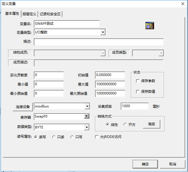 由于在组态王系统中,官方定义了在与Modbus协议类型的设备相连的话,其传输数据的字节会进行交换,因此我们还需要另外建立一个变量,将内存中的数值的排序进行变换,从而获得可以正常阅读的数据。该变量配置如图7所示。