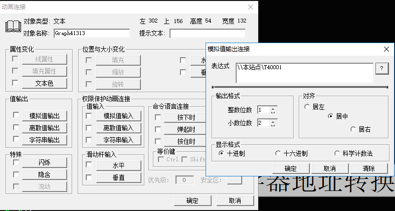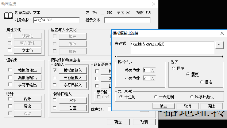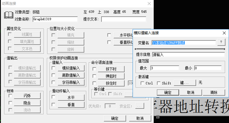 (7)界面上的变量配置建立完成之后,我们需要将其数值的显示与先前配置好的变量进行连接匹配。因此,通过八个变量的动画连接、一个SWAP测试变量以及切换按钮的动态连接来进行配置。普通变量的配置如图3.12所示,SWAP变量的配置如图16 所示,转换按钮的配置如图17 所示。