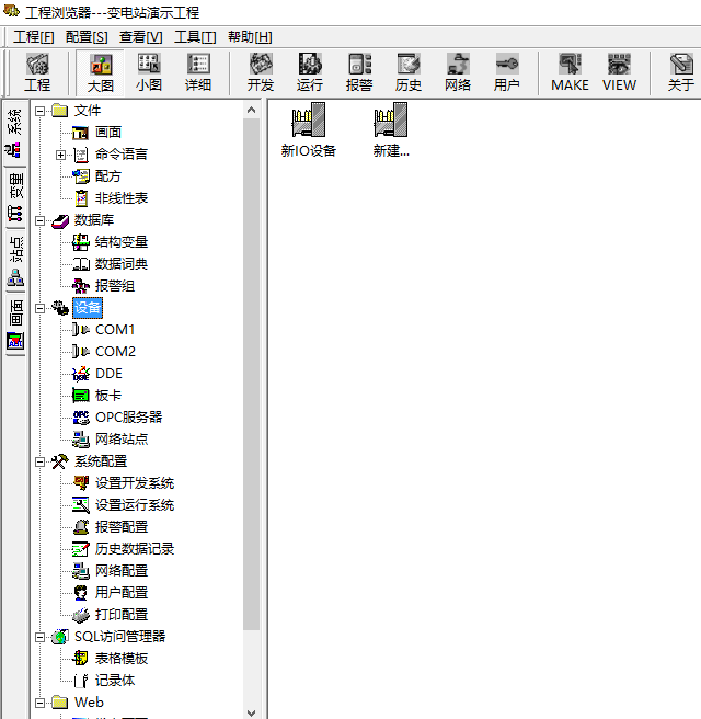 (1)首先我们需要选取变电站类别的示例,并启动组态王管理器。因为我们需要模拟建立一个接收Modbus信号的变电站系统,所以选择新建Modbus设备。