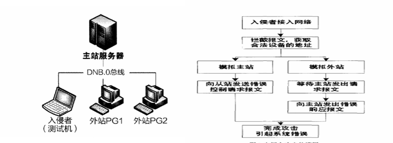 执行中间人攻击时,入侵者直接或间接接入被攻击的SCADA系统的网络中,入侵者先保持静默,拦截总线上的正常报文,获取当前总线上的设备地址,然后模拟系统的主站或外站,向系统内的某个合法设备发送错误的报文,使SCADA系统工作异常。中间人攻击可以分为模仿主站攻击和模仿外站攻击。