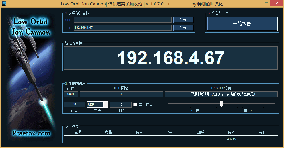在另一台机器打开低轨道离子炮LOIC,我们选择用该软件对Server端进行攻击,输入61850Ser端地址192.168.4.67。选择UDP攻击方法,开始攻击。
