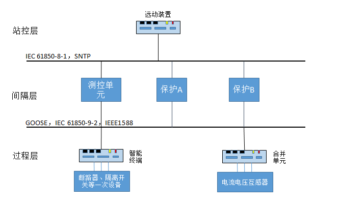 基于IEC61850标准的三层架构的变电站自动化系统如图2所示,新增的过程层设备与间隔层设备之间采用光前以太网进行连接,通信服务使用过GOOSE和IEC61850-9-2标准。应用IEC61850-9-2标准传输网络化的采样值时,数据的同步是关键技术之一要求比较小的事件延迟,因此在应用层和逻辑链路层之间不使用其他协议,为了提高效率采用以太网多播方式。