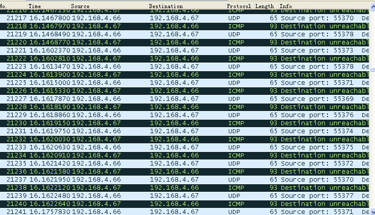 此时在Server端打开wireshark抓包,可发现大量相同源IP地址的UDP和ICMP包,如下图所示。