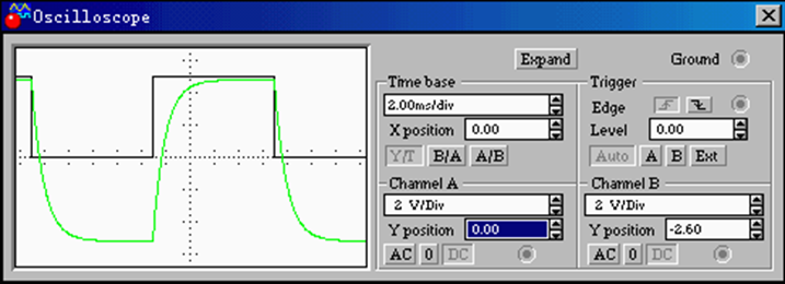 按空格键将开关连接到周期脉冲信号源上。启动电路仿真开关,这时在示波器上可以看到两个波形(下图)。输入波形为周期方波,输出波形为按指数规律上升、下降的脉冲序列。改变输入脉冲波的频率,可以看到输出波形的形状发生变化。