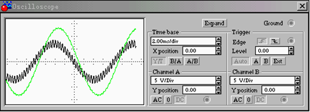 按空格键将开关连接到两个正弦交流信号源上。双击连接示波器输入的导线,将两个通道的输入导线设置成不同的眼色以便于波形的观察。打开示波器面板,启动电路仿真开关,这时在示波器上可以看到两个波形(下图)。输入波形为60H正弦波与2kHz小幅度正弦波的叠加波形。输出波形中,2kHz正弦波成分已经基本上被滤除。