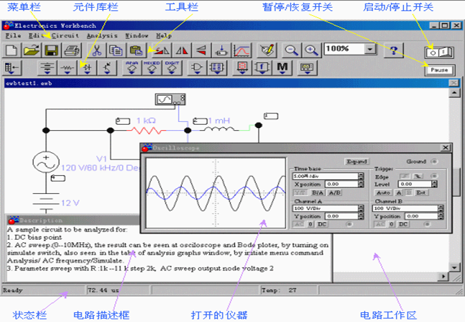 (3)EWB软件带有丰富的电路元件库,提供多种电路分析方法。