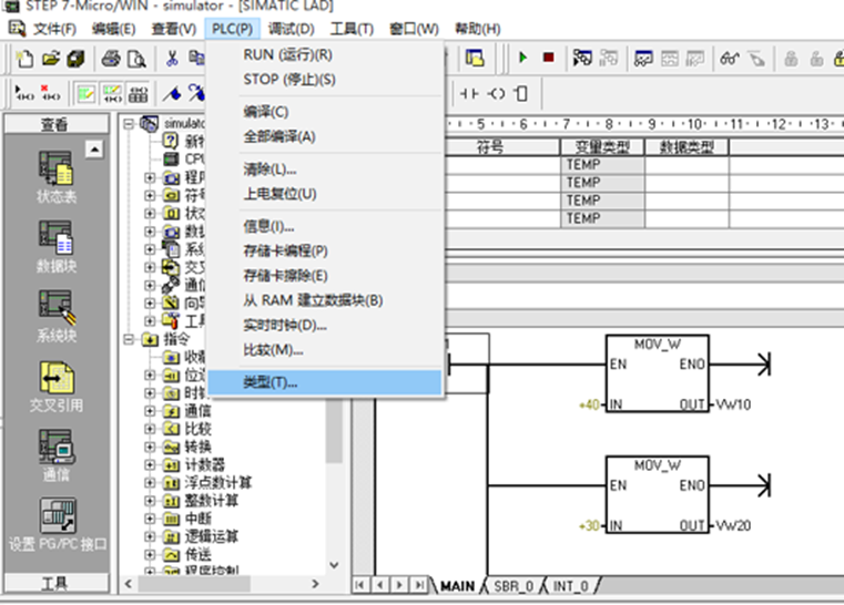 点击PLC按钮,展开,找到类型。
