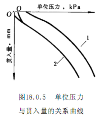 ①以单位压力(p)为横坐标,贯入量(l)为纵坐标,绘制p-l 关系曲线,如图18.0.5所示。图上曲线1是合适的。曲线2开始段是凹曲线,需要进行修正。修正时,在变曲率点引一切线,与纵坐标交于O′点,O′即为修正后的原点。