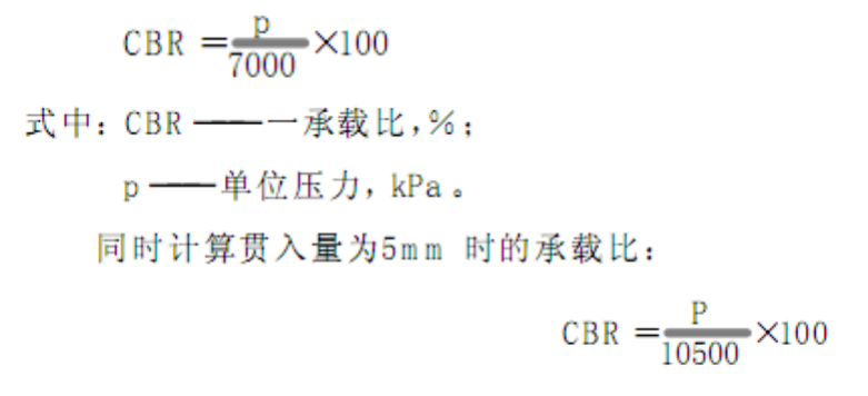 ②一般采用贯入量为2.5mm时的单位压力与标准压力之比作为材料的承载比(CBR),即: