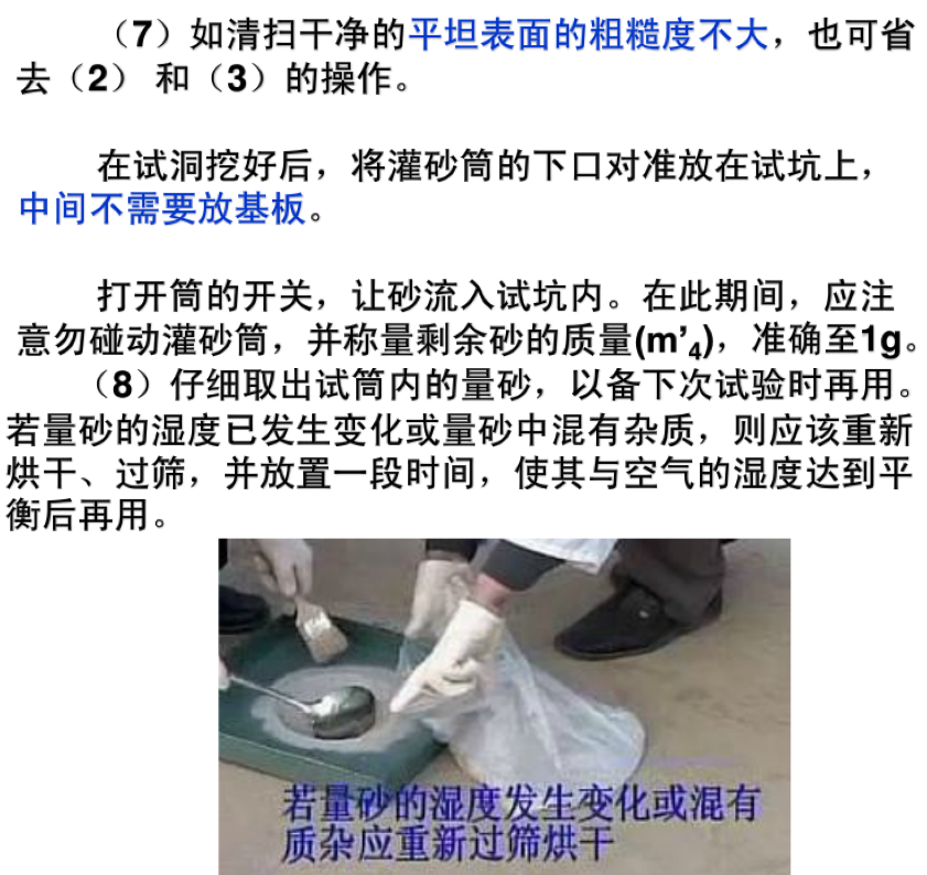 7.取出试洞内的量砂,以备下次试验时再用。若量砂的湿度已发生变化或量砂中混有杂质,则应重新烘干,过筛,并放置一段时间,使其与空气的湿度达到平衡后再用。