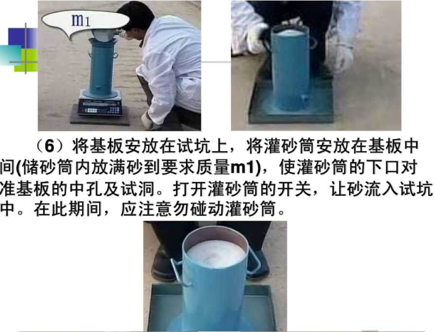 5.将基板安放在试洞上,将灌砂筒放在基板中间(灌砂筒内放满砂m1),使灌砂筒的下口对准基板的中孔及试洞。打开灌砂筒开关,让砂流入试洞内,直至灌砂筒内砂不下流时,关闭开关。小心取走灌砂筒,称量筒内剩余砂加灌砂筒的质量m5,准确至1g。