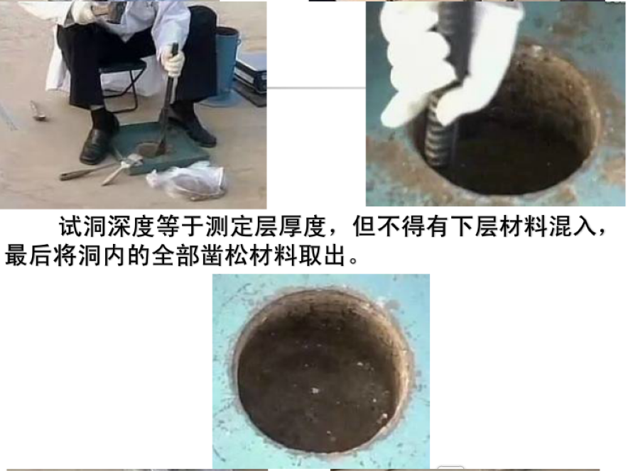 3.将基板放回清扫干净的表面上,沿基板中孔凿洞。在凿洞过程中,应注意不使凿出的试样丢失,并随时将凿松的材料取出,放在塑料袋内密封。试洞的深度应等于测定层厚度,但不得有下层材料混入,最后将洞内的全部凿松材料取出。称量重量mw,准确至1g。