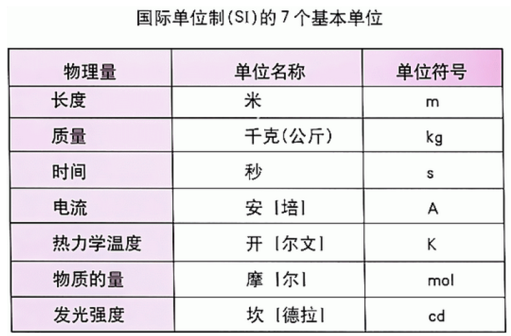注:1954年第十届国际计量大会决定采用米(m)、千克(kg)、秒(s)、安培(A)、开尔文(K)和坎德拉(cd)作为基本单位。1960年第十一届国际计量大会决定将以这六个单位为基本单位的实用计量单位制命名为“国际单位制”,并规定其符号为“SI”。1974年的第十四届国际计量大会又增加将物质的量的单位摩尔(mol)作为基本单位。因此,目前国际单位制共有七个基本单位。