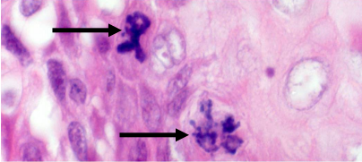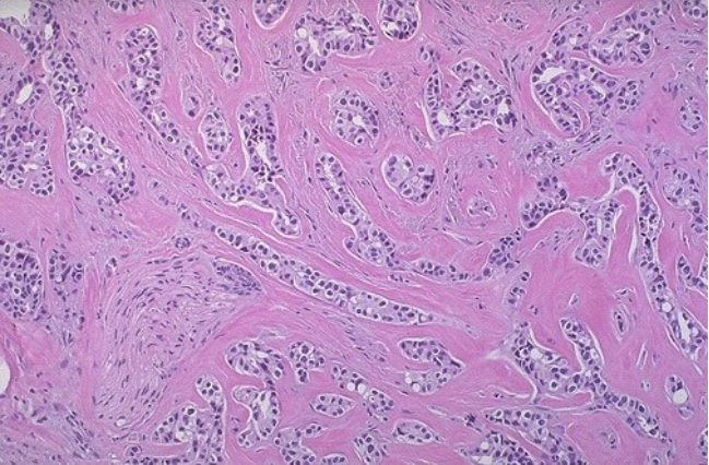 患者,女,35岁,发现右侧乳腺包块2个月,右侧腋窝淋巴结增大2天。肿块质地较硬,边界不清。活检组织学检查图像如图1所示。图2是高倍镜下的一个视野。患者有乳腺癌家族史。