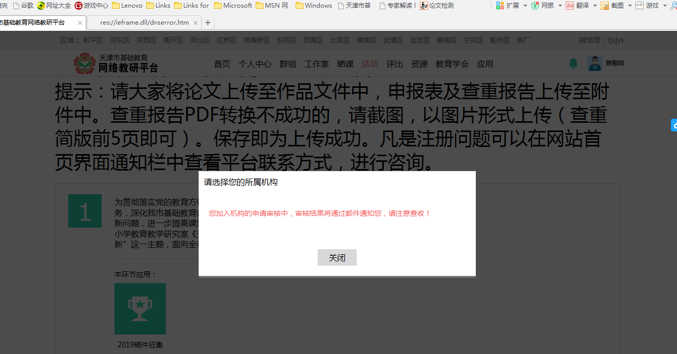 解决方法:请学校管理员联系本区教研平台管理员,把学校名称加入本区教研平台的组织机构里