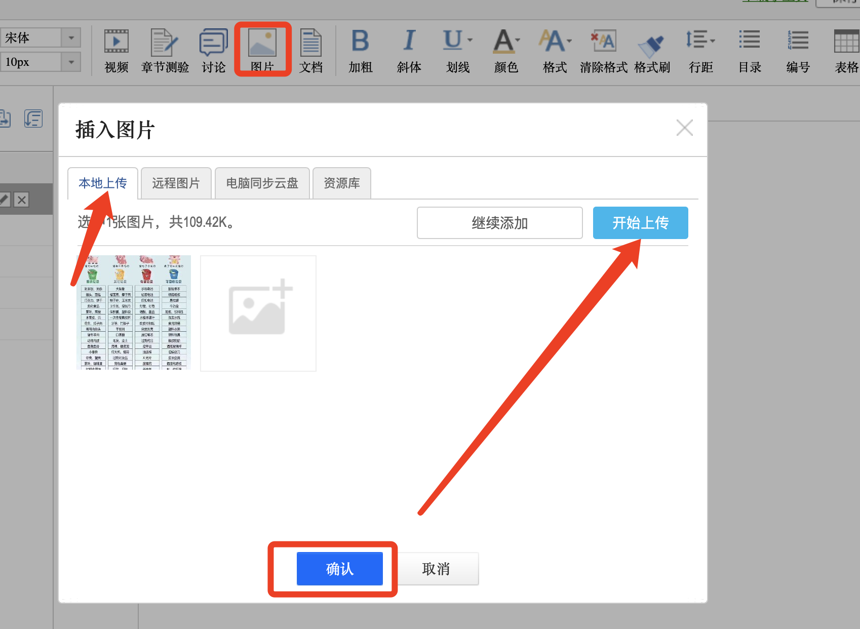 本地上传:选择要上传的图片,点右上角“开始上传”,图片处进度条走完,点确认,方可上传成功。