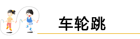 车轮跳是两人或多人配合的跳法,两人或多人并排站立,内侧绳结绳交叉,相互握住相邻同学的一根绳柄,跳跃时绳子依次打地,就像车轮在滚动,我们叫它车轮跳。