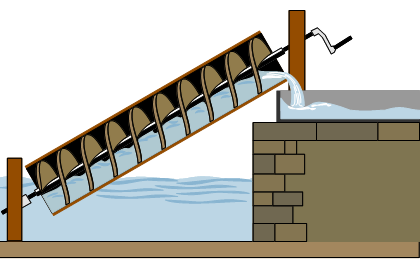 阿基米德立即根据这一设想,画出了一张草图。他拿着这张草图去找木匠,请求师傅帮他做一个用于泵水的工具。”经阿基米德的指点,木匠制出了一个怪玩意儿。阿基米德将这个东西搬到河边,并把它的一头放进河水里,然后轻轻地摇动手柄。“咕噜噜”,只见河水在摇动手柄的同时,从怪东西的顶端不断地涌出来。水,果然往高处流了。