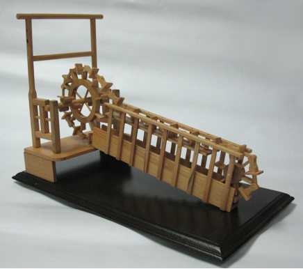 在螺旋水泵问世后不久,我国也发明了一种抽水工具——龙骨水车。据说是东汉灵帝时的毕岚发明的。这种水车的主要装置是一个木板制成的槽,槽内相隔一定的距离放置瓦片大小的木块,这些木块通过销子连结起来。整个样子像龙的骨架,因此得名。使用时,人扶着水车顶端上的木架,用脚踩动拐木,就带动下面的木块沿着木槽往上移动,由此把水提上岸;而后木块又往木槽的背后往下移动,直至绕过下端的轴,重新刮水。后来,有人又对龙骨水车进行改进,发明了“畜力龙骨水车”、“水转龙骨水车”。