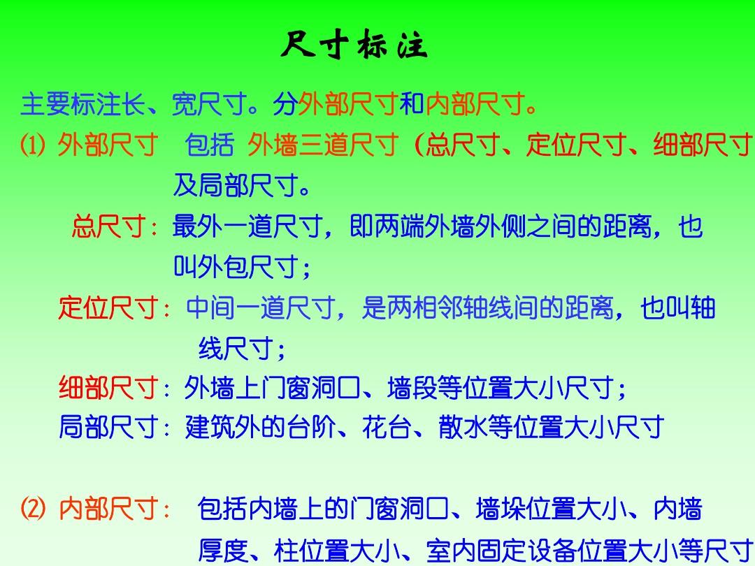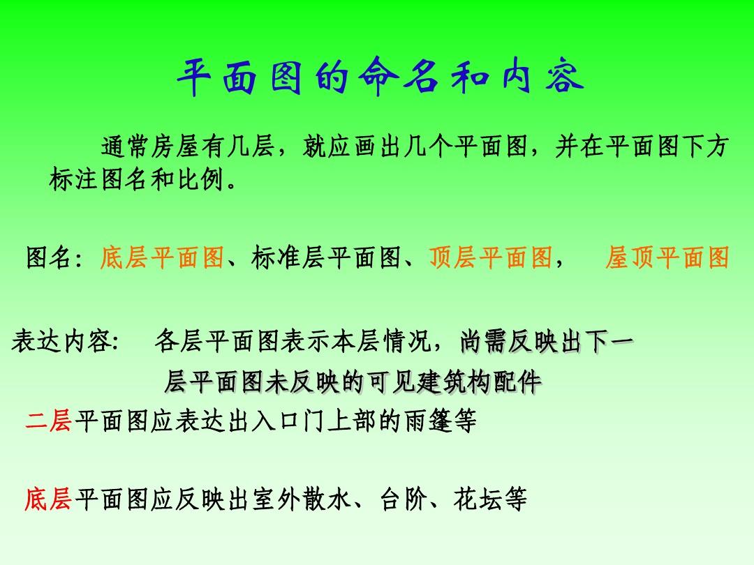 命名方式一般以要表达的楼层命名,如底层(首层)平面图、标准平面图、中间层平面图、二~八层平面图、九---十五层平面图、顶层平面图等。通常情况下,建筑物有几层就画几个平面图,楼层平面相同时,只画标准层平面图。