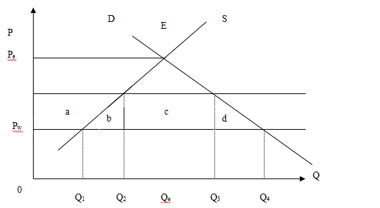 由于是贸易小国,其进口不能改变X产品国际市场价格Pw,在自由贸易情况下,所以出口国的X产品以Pw价格进入小国,形成水平的供应线。因为Pw<Pe,小国X产品生产者缺乏竞争力,从而会减少生产供应量,即由Qe缩减为Q1,消费者却因进口品价格便宜而增加需求,由Qe扩展为Q4,出现了供不应求状况,为满足消费需要,则进口小国需要进口Q1 Q4数量的X产品。
