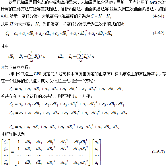 GPS高程拟合就是利用在范围不大的区域中,应用GPS测得的坐标(大地坐标或者是平面坐标)和应用水准测量技术测得的水准高程,计算测点的高程异常,而高程异常具有一定的几何相关性这一原理,用数值拟合法,拟合出测区似大地水准面,由此根据测区内的其他点坐标内插出其高程异常,从而求出待定点的正常高。