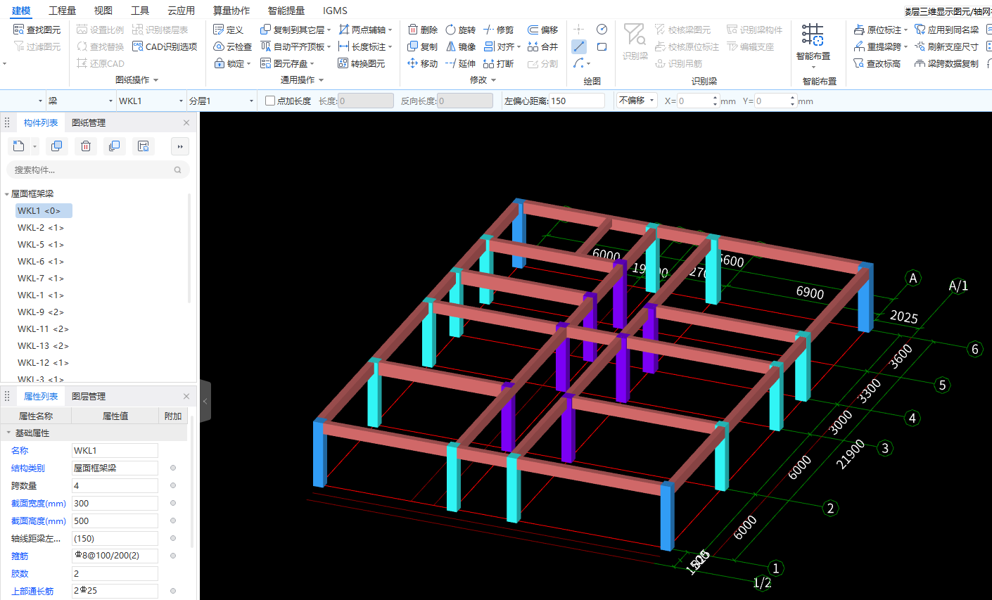 对顶层的梁要注意,因为屋面框架梁(WKL)的大小发生变化,有的梁高度发生变化,要记得修改构件属性。