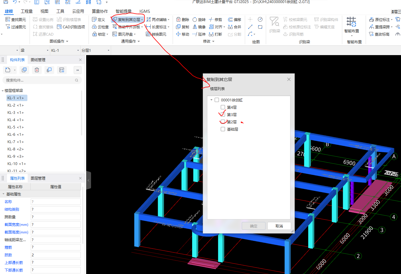 注意:“复制到其他层” 要先选择好构件,然后选择好“方向”