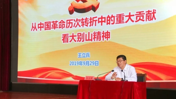 本网讯 大别山雄踞鄂豫皖三省,其特殊的地理位置具有重大的军事战略价值,是一座革命的山、英雄的山、光荣的山。习近平总书记在湖北红安、安徽六安、河南新县考察时指出:“鄂豫皖苏区根据地是我们党的重要建党基地,大别山精神是我们党的宝贵精神财富”,“要提炼好、弘扬好‘大别山精神’,让红色基因代代相传,让红色江山永不变色”。为深入贯彻落实习近平总书记重要讲话精神,9月29日,校党委书记王立兵在党委理论学习中心组“不忘初心、牢记使命”主题教育读书班上以《从大别山在中国革命历次大转折中的重大贡献看大别山精神》为题,发布了“大别山精神”最新研究成果,将大别山精神概括为“坚守初心、勇担使命、紧跟党走、不胜不休”。