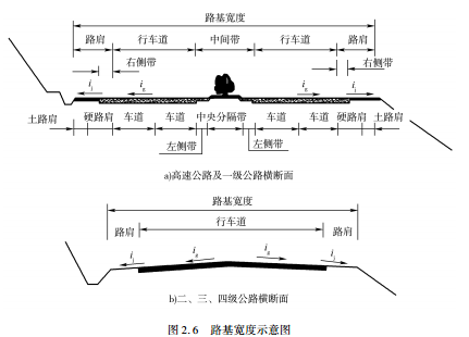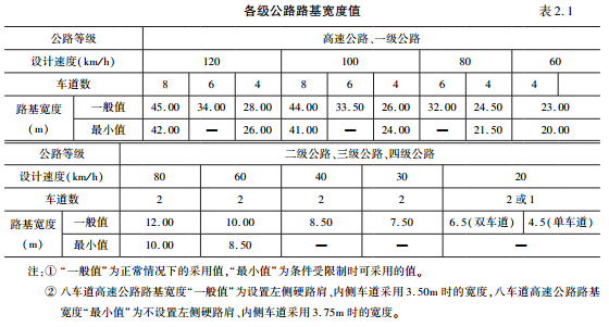 路基宽度为路面及两侧路肩宽度之和ꎮ 路基宽度组成见图 2. 6ꎮ 根据现行«公路工程 技术标准 (JTG B01 - 2003)»路基宽度取值见表 2. 1ꎮ