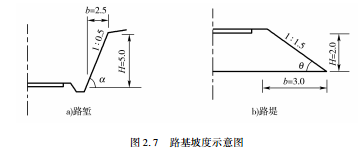 2. 2. 3 路基边坡坡度 路基边坡即路肩的外边缘与坡脚(路堑则为边沟外侧沟顶与坡顶)所构成的坡面ꎬ是支撑路基主体的重要组成部分ꎮ 路基边坡的坡度ꎬ习惯上用边坡的高度与宽度的比值表示ꎬ并 取 H = 1ꎬ如 1∶0.5、1∶1、1∶1.5、1∶1.75 等ꎮ 路基坡度示意图见图 2. 7ꎮ