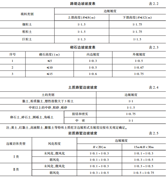 现行«公路路基设计规范» ( JTG D30—2004)规定ꎬ对不同情况下的路基边坡坡度值应 不大于表 2. 2 ~ 表 2.5 的规定值ꎮ
