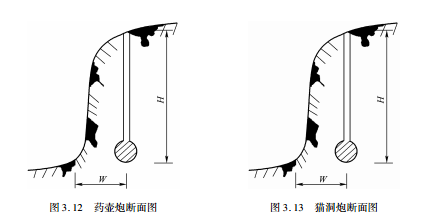 ④药壶炮(葫芦炮)ꎬ是指在炮眼底部用少量炸药经一次或多次烘膛ꎬ使炮眼底部扩大成 药壶形(葫芦形)ꎬ然后将炸药集中装入药壶中进行的爆破ꎬ如图 3. 12 所示ꎮ 葫芦炮炮眼较深(一般为 5 ~ 7m)ꎬ它适用于均匀致密黏土(硬土)、次坚石、坚石ꎮ 对于炮眼深度小于 2. 5mꎬ且节理发育的软石、地下水发育或雨季施工时ꎬ不宜采用ꎮ