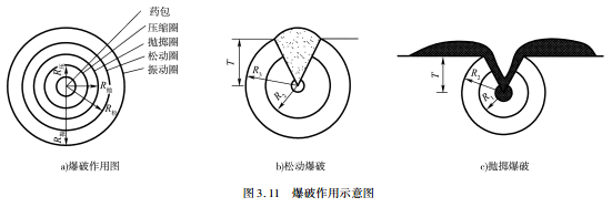 爆破冲击波由药包中心呈球面向外扩散ꎬ按其破坏程度大致分为四个作用圈ꎬ如图 3. 11 所示ꎮ